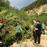 Am nächsten Morgen ertönte das steinzeitliche Muschelhorn zum Wecken. Nach dem Frühstück machten wir uns auf den Weg: durch den malerischen Burgwald, vorbei an unserer Wolfhainhütte, in den alten Sandbruch. Dieser ist heute ein Naturschutzgebiet. Unser Forstpate Norbert erklärte, dass der Sandbruch unter anderem seltene Bärlapparten, deren Sporen man zum Feuerspucken nutzen kann, 4 Reptilienarten und 12 der 20 in Deutschland lebenden Amphibienarten beherbergt. Um diesen schützenswerten Lebensraum zu erhalten, entfernten wir junge Birken, Kiefern und Fichten. Dadurch bleiben die für die Reptilien und Bärlappe wichtigen sonnigen Freiflächen und die für die Amphibien essentiellen Tümpel erhalten. Die Notwendigkeit der Pflege dieses bedeutsamen Habitats motivierte Norbert im Jahr 2009 eine Jugendgruppe im Rosphetal aufzubauen. Die Sandgrube ist damit die Keimzelle und der Ursprung unserer Gruppe am Rande des Burgwaldes.![]()